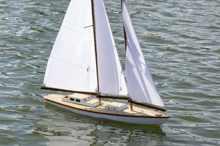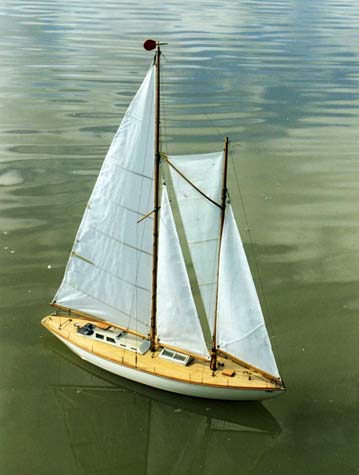 Borrowing the mould of Murray White’s sloop Scout, Keith once the hull was ready fitted frames and a 1/16 ply deck and then took measurements of its cabins and hatch of Dennis Lake’s small Argus schooner, added coamings, fitted RC gear and ended up with the schooner he named Tomahawk . When photographed it appeared to sail very well.