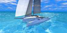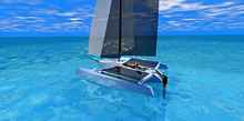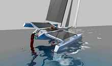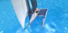 The skipper sits in the main hull in a semi-reclined position, much like the driver of a Formula 1 car. The main deck of the cockpit is slanted aft for self-draining through the open transom. All controls are led to the cockpit and the rudder is controlled with foot pedals. For those who wish to put the hammer down, the skipper can exit the cockpit and sail the Corsica from the tramps with a tiller extension and an easy re-routing of the sheets.