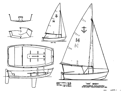 Vita is not a new design. The oldest drawings that I can find are dated January, 1965. Before Vita I designed and built a sharp bowed dinghy which I called "Diamond", 2.9m by 1.32m. That was my first Taped Seam boat, soon after I had read of the Mirror Dinghy In the magazine Yachts and Yachting of 8 February 1963. I was not happy with its stability characteristics. Lightweight sharp ended boats have a tendency to capsize if the crew weight is concentrated in the sharp end. So, I designed a pram using the same four by ten foot plywood panels. The length and beam were each increased by four inches. It makes a much roomier boat and I would expect it to be a faster sailer with the same rig.