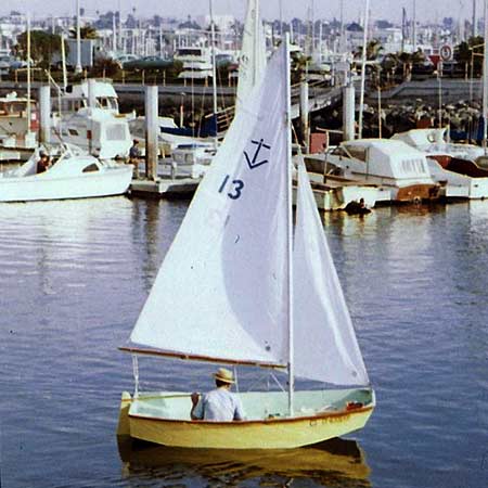 The year was 1965. Bruce Embody, then living in Cocoa Beach, needed a small boat that he could sail around the canals and waterways. His wife, Phyllis, needed a stable, easily rowed boat for fishing. To meet those requirements I designed VITA, a sloop rigged V bottomed pram, 9'-10" x 5'-O". The construction is by the Taped Seam method, using all 1/4" fir plywood. Taped Seam. consruction, (lately called Stitch and Glue by some), was pretty new in 1965. It had many obvious advantages over previous methods for plywood - no chine logs, no keel, no frames, no stromgback or building form, no lofting, no boatbuilding expertise required.