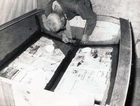 10' panels are available in marine plywood. The exterior sheer stringers are laminated on a simple form from three pieces of 1/2" mahogany. All outside surfaces are sheathed with fiberglass cloth and epoxy. At first we used resorcinol glue for gluing and polyester resin for sheathing, but since epoxy became avaliable we use nothing else.