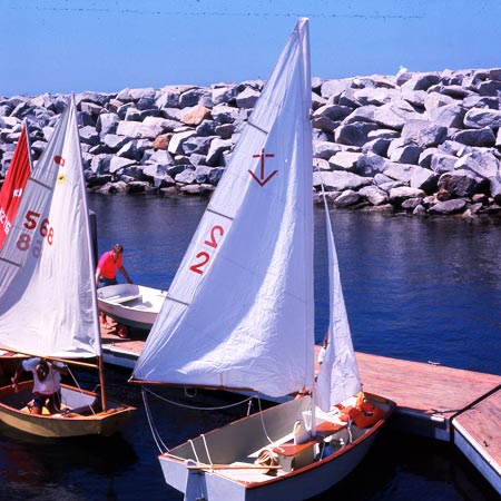 Putting a divided rig on such a small boat is a moot point. It is good for teaching the young, or not so young, to sail the type that they may go to later. It may be rigged sloop or cat. so that the beginner may learn one sail at a time. The mast is made of stock aluminum tube, called construction pipe, simpler to use and less expensive than Sitka spruce. It is easily jointed with a wooden plug. There are two shrouds and a forestay, but minimum hardware. There are no rigging screws, adjustment is by lanyards and rings. The main has a sleeved luff, which is simple and clean, but some have chosen track and slides. A very simple, one sail, "No-Halyard" rig is an option.