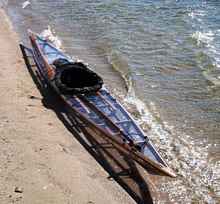 You also have a wide variety of skin choices, depending on your needs and budget and whether or not you want your kayak to be foldable. Chuck and Sandra Leinweber have been paddling their canvas skinned boats for years. They used house paint to seal the canvas. And let us not forget Franz Romer who crossed the Atlantic in a canvas kayak in 1928, or Hannes Lindemann's 1951 repeat performance in a folding canvas Klepper. A canvas skin is heavier and more fragile but less expensive than other options. Many of Tom's boats, particularly the folding designs, are skinned with a commercially made vinyl-coated polyester. Or you can sew your skin on in a more traditional style with extremely tough modern fabrics such as ballistic Nylon or heat-shrinkable Dacron in place of the traditional seal skin. Tom and a number of his acolytes have even skinned their kayaks in transparent vinyl, which makes for a sexy see-thru boat.