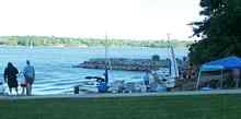 New friends and old friends pulled in as the sunny afternoon moved along. Steve B. had a shade tent and table, and we tried to get everyones name & boat and email; providing name tags to help us get to know one another. Norm Wolfe arrived with the "Norms Boat" he commissioned Jim Michalak to design. Back issues of Duckworks can fill you in on this well travelled and very able craft. Paul Truszkowski and wife Margaret pulled in with three boats packed on to his pickup. Larger boats used one of the four ramps; smaller boats were just carried to the beach without need for the ramp fee.