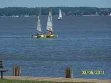 There was way too much going on for one person to take in, but here some "takes" from my memory as the weekend un-folded. I pulled in about 10am Friday and registered for the campsite co-host Steve Bosquette and I had reserved. I got my 40 year old tent up and got down to the ramp & beach before 11. A glance to the water - the Elk River at the confluence of the Chesapeake - caught a bi-plane sail catamaran sailing crisply in an 8 -12 NW breeze. Paul Moffitt and his Dad Bill (who flew up from Atlanta) easily logged the most time on the water ... although others were in contention. There was a lot of sailing.