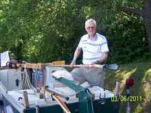Margaret Truszkowski with Paul's "Tardis" (ask him about the name). At 5'10" it was the smallest boat ... note the rudder plate. |