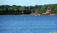 Norm Wolfe heads over towards Cabin John Creek for the night. The river is a mile wide, with the shipping channel centered ... serious wakes, no problems. |