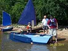 Vaughn (left) and Tom Maurer (right) arrived late Friday and launched their new, father-son PDR build Saturday morning. The first sail was a huge success ... across the river, up Cabin John Creek & back, with exploration of the South shore, too! (And as it happens, they're neighbors of mine). |