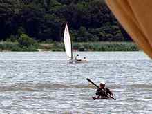 The white marshcat is Kevin MacDonald .. sorry, don't recognize the kayak. These waters are prime boating water ... big enough to stretch out, small enough for most any type of boat ... we proved it. |