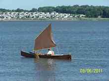 Paul H. in the Quick Canoe modified for sailing ... a larger & smaller sail. By the time this is published I'll have met Michael Storer & (finally) Chuck Leinweber at the Wooden Boat Show at Mystic, Ct. |