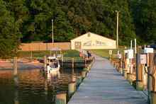 View from the end of the dock ... store with some supplies and ice cream ... those are transient slips on the right (none used at the time). |