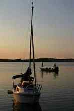 My Wanderer, the "Terry Jeanne", Saturday before supper ... first time with the sprit mainsail ... Steve B. teases me about having "twin screws" ... look closely. |