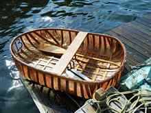 Michael Burwell's Ballistic Coracle - 1st Place Paddling Division. Ballistic nylon skin with urethane coating over okoume ply strips. Seat of maple, seat supports live oak. Sitting on the semi-floating dock. |