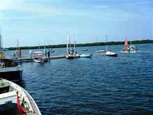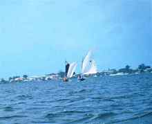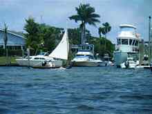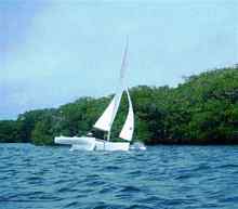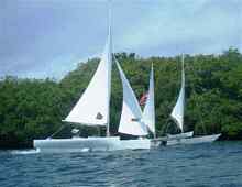 Frank Smoot's trimaran "No Commotion" passing Mark Stewart's trimaran "Shark Bait" |