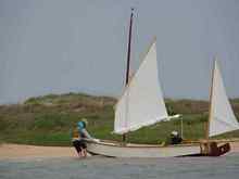 The OBX 130 is a 5 day raid type event, a 130 mile round trip from our launch point to Cape Lookout at the southern end of the sound. The event was hatched by Paul Moffit. His dad Bill and brother Shaun had brought their Joe Michalak designed Mikesboat. Paul is 20-something romantic who had developed a deep love for the Outer Banks. He wanted to share this remote cruising ground with fellow sailors. Chuck Leinweber had come along to crew with Bill. I quickly learned that many of these OBX sailors are a breed apart. They build boats themselves, often a new one for an upcoming event. They report slapping a boat together in a few weekends out of plywood and epoxy. Paint them up so they look pretty good. Andy Linn and Mike Monies were sailing a Laguna, a long barge with two masts and professional looking polytarp sails that Andy sewed up. They were doing the raid circuit from the Everglades Challenge, the Florida 120 and heading for the Texas 200. Three of the boats were Michalak's designs - single leeboards, real shallow draft. Perfectly designed to bump and grind across the shallows in Core Sound.