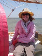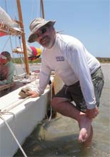As the day went on and we approached the Mansfield Jetty, the wind increased, thus increasing the size and pattern of the swells, probably running about 5 to 7 feet. It became apparent that we were on the verge of being out of control as we were surfing down the waves (11 knots!!) so we decided to take the jib down and put up the smaller staysail. This staysail is actually the sail from a windsurfer that Chris had salvaged and I had done a little sewing on. Chris had modified our boat to have all the lines running aft so we were able to take the jib down without leaving the cockpit. However, the lazyjack hung up on the gaff jaw and I went forward to try to release it. I was too short to get it loose so I returned to the cockpit and Chris went forward. He was able to get it released and, one second the boat was under him and the next second it was not. Man Overboard! This is the really scary part. He never let go of the boat when he fell in so that was a good thing but when he tried to hoist himself back onto the boat, he couldn't manage it. I radioed the other boats to alert them of our situation and asked that they stand by in case we needed help. Meridith had popped up from her bunk and, while I held the boat into the wind, she took my knife and quickly cut the swim ladder free from its storage spot, hooked it onto the side of the boat, and Chris was able to get back in. She mentioned to Chris, "Well, at least you had a chance to pee." and Chris responded, "I was so scared, I forgot to." We all had a good laugh about that and then we set about getting the staysail rigged up.