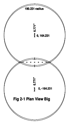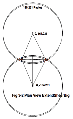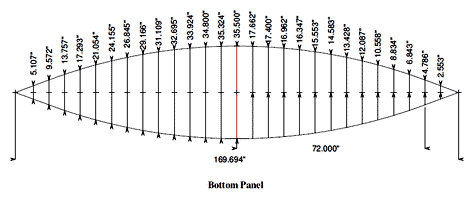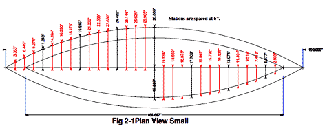 The only thing I could not figure out was the length of the bottom panel. The profile view gives the chord of the arc, but I could find nothing for the length. I finally used Visual Cadd to draw a spline curve to connect the points which were at 6"intervals and then had it calculate the length of the arc between each point. The end result was accurate, as the length of the side arc of the bottom came out within a few thousands of the length of the side's chine. Please note that the widths calculated in Excel do NOT exactly match those in the bottom panel figure. The reason is that I redrew the stations back to 6" intervals on the bottom view. Eventually it occurred to me that the curve of the profile might be close to a circle. I found that the length of the arc of a circle that touched the midpoint and the ends of the rake curve was identical to what I had calculated with Visual Cadd. I added the formula for finding the circle at the end of the Excel spreadsheet. It is possible that Excel can find the real spacing between the 6" stations and the real length of the bottom, but that will have to wait for another day. If anybody knows of other ways to find the length of the bottom, please let me know.