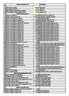 Article 5 insists that it is easier to loft the boat full-size rather than using an expensive computer and software. Maybe so, but most people do not have room for a 16 foot wooden floor, and my Visual Cadd measures more accurately than I could with a compass. Once I have drawn the boat, I can easily print the panels to make a scale model to find any mistakes. Eventually I figured out that an Excel spreadsheet could do all of the calculations if I could input the right formula! The answers it outputs and the formulas can be seen in the attached figures. I apologize that some of the names are not very descriptive; that is why I printed the formulas to the right of the answers. And, yes, I know that there is no need for three-decimal place answers, so feel free to round-off to the nearest 1/6th".