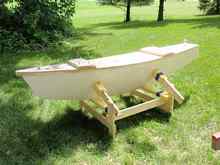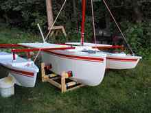 I am almost done building a trimaran dinghy. After spending countless hours sanding, fairing, sanding, priming, sanding, painting, sanding, painting, sanding, and painting the three hulls, I needed to flip the bulls over so I could do the same for the decks . . . And then be done! But, both outriggers and the main hull have vee bottoms. They won't sit upright on their own. I needed some easy to build cradles to hold the hulls upright without scratching the new paint on the hulls.