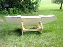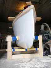 Boat support: A pal is helpful for this step. Lift the boat onto the cradle, being careful not to knock the boat on the arms. Lower the boat onto the cushioned keel boards, roughly centered. Your pal should now hold the boat vertical while you attach arms at the bow. Note from Figs. 1-3 how the arms are angled so the foam mitts seat nicely against the hull sides. Use a pair of pocket screws to attach each arm.