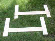 Leg assemblies: Using your four legs and two cross beams, assemble two identical leg assemblies as shown in Figure 5. The cross beams are screwed to the legs with three pocket screws at each joint. Note the cross beams and legs make an H with the cross beam closer to the bottom of the H than the top. Specifically, I placed the cross beams 3.5 inches from the bottom. This is the width of a 1 x 4. Hence, I was able to use scrap 1 x 4 as a spacer to locate the cross beams on each leg.