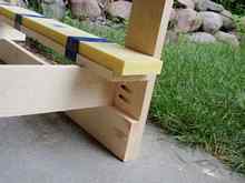 Girders: A pair of girders connect the two leg assemblies. See Fig. 7. These rest on the cross beams but are screwed to the legs using pockets and pocket screws. A pair of pockets are made in each leg for this attachment. I used a Kreg pocket jig. Fig. 9 shows the pocket holes for the girder attachment close up.