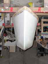 The main hull, by the way, is tortured plywood. This approach provided a nice vee bottom and a bow with a fine entry. Fig. 4 is another view of the main hull while it was still upside down. Check out those reflections in the main hull!
