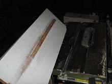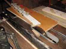 The piece of scrap particle board used for a base, with its guide rail glued and screwed to the underside. That guide rail is a neat fit in the groove on the sawbench, so much so that I had to put some beeswax on it and push it back and forth for a while before it slid through easily, but better that than a loose fit that would allow it to move and make the cut of the stringers taper less accurate. |