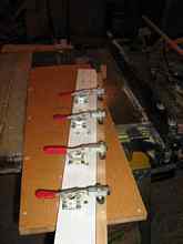 I screwed and glued the offcut to the top of the base piece, making sure it was at just the right angle, and mounted the over center clamps to the top of it. Take care that they all of them clear the saw blade when you slide it through! |