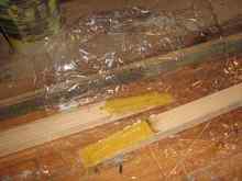 I then clamped a piece of wood with a nice straight edge to the bench, buttered up the joint with a goodly amount of thickened epoxy (nitrile gloves for safety) and, putting a piece of kitchen wrap on the bench and up the edge of the guide piece assembled the first one, I overlap the slopes a little more than needed. They slide into place with the side pressure when applied.