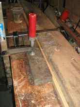 With the scarf angles cut, gluing them together is the next task. I’ve a 3m (10 ft) long bench, and was looking to make pieces about 5m (16 ft) long, so put a support under one end of the assembly, just to prevent the sag from upsetting the join.