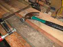 Next, clamp it sideways, so a caul piece is laid alongside the pieces to be clamped and an “F” clamp applied, just medium pressure. Then the joints are tapped down flat with a piece of wood and hammer before winding the clamp up tight.