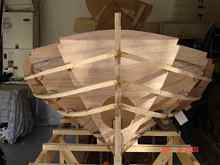 John French sent me this photo of his Navigator sailing dingy all stringered ready for planking, the scarfing joints as shown above makes joining all the long pieces together easy to do. |