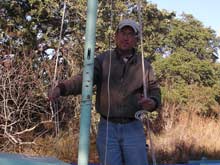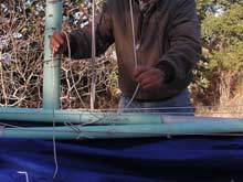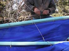 12) Wow! This is getting long, isn't it? Fortunately we are almost there. If you are losing focus, go back to the top of the page and play that video again - that will remind you what we are trying to accomplish. Oh, yeah, here I have brought the forward lazyjack around outside of the sail and both spars and will attach it to the clamcleat by my right hand in the picture at left.