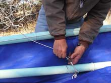 7) To keep things clear, the upper spar is the yard and the lower one is the boom. Here I am threading the starboard lazyjack through the inner jackline (the one next to the mast) - from there it will go down, around the sail and through the block that is lashed to the boom.