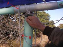 19) Here is a close up showing more detail. Notice that the downhaul ("A") is tied to the cleat, lead around the mast and over the boom before running down to another cleat. "B" shows one of the loops in the lazyjack being hooked over the cleat.