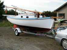 The 18 ft gaff sloop "May" a few minutes after arriving at her new home. Beautifully built and finished, she just needs a few final touches to be perfect. |