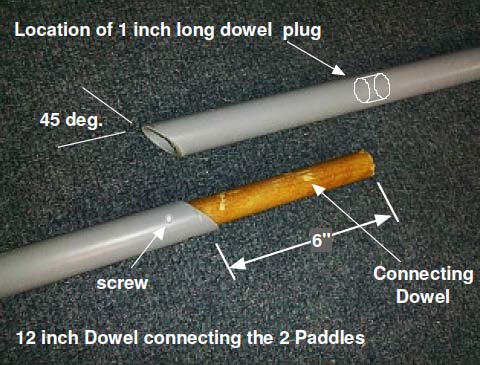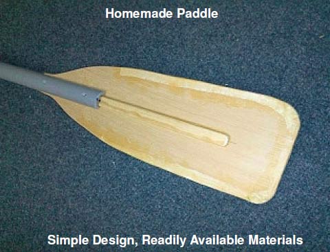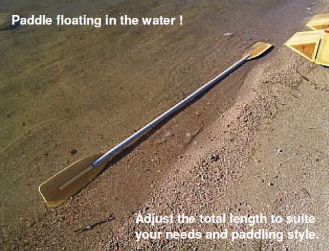 The design goal for this paddle was to develop a low cost, easy to make, adaptable paddle for a kayak, canoe or any other small boat that requires manual propulsion. The end result is a double-paddle that costs about $15 to make, and can be lengthened, or shortened, to suite the application. Because it is built in two sections, it can even be used as a single paddle for canoes or for just leaving the dock, or positioning the boat for launch. The design is not intended for rough water use, such as river rafting, but it can be ruggedized by adding a dowel to the entire inside of the handles, and by increasing the thickness of the paddles.