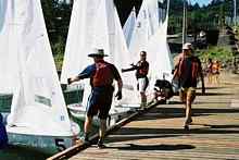 I have taken sailors out on the Thistle who were used to sailing on more sedate boats. They end up asking for “a little warning, please!” when we tack. Over the years, I had gone from “Ready about! Everybody ready? Okay we’re tacking! Helms alee!” to “tack”-WHAM. Trying to keep up with the Thistle fleet tacking up the Willamette River, you have to tack without deliberation. At one point, I got the yips. The yips is the disease a shortstop has when he is inexplicably unable to throw the ball to first base. My yip was that I could not tack without dropping the tiller extension. The more I thought about it, and concentrated, the more I dropped it and left the boat and crew wallowing head to wind as the other Thistles sailed away. I got my mojo back one day and have, 1000 tacks later, got it down to “tack”-WHAM. A rewarding exercise on the Laser is to set two marks, windward and leeward, about 75 feet apart, and run a small fleet on an endless race between the two marks. In a breeze, you end up with everyone tacking or jibing every 5 to 10 seconds. Hike, trim, daggerboard, vang, cunningham, outhaul, sheet, jibe, daggerboard, vang, cunningham, outhaul, trim, tack, hike. You learn the choreography or you end up in the river with the sheet around your legs and the tiller extension up your nose.
