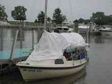 View toward stern. A semicircular piece of tarp was sewn on the back. The rest of it was cut from one piece. The diagonal tie-downs keep the boom from swinging.