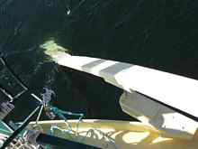 We thought we might need to fabricate a weight to put on the end of the blade to sink it. Using the yuloh has made this initial impression unnecessary. The yuloh does float a little at rest but once it is started it quickly sinks down to its working position. The operator simply starts the sculling action with the shaft in both hands. After one or two strokes the yuloh lifts to its full operating position and the thrust and pull of the yuloh is made with the lanyard. In our case the yuloh is mounted on the port side. The right hand is the power hand on the lanyard and the left hand is the balancing hand located on the yuloh near the bend. The bend in the yuloh provides a fulcrum that flips the yuloh with very little energy expended.