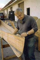 Here I am being the bearer of sad news again. Another great wooden boat builder has gone on to the big boat shop in the sky. Dale Andrews died last weekend after a long fight with the big C. Dale's favorite designs to build were striped, bright finished canoes, kayaks and melonseeds. In this picture he looks like a serious builder, not to be trifled with. He was a good friend of another great builder, Mac McCarthy. They built boats together for a dozen years and I'm sure intimidated the hell out of hundreds of guys who came in to build one of the "Featherlite" canoes. I'd hate to have been a rookie builder with these two perfectionists around. Rookie hell, I stopped in once to ask for a little advice and he told me to take up stamp collecting.