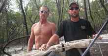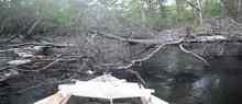 This proved to be far more arduous than I had anticipated: the St. Marys had very little water in it up around St. George, where I put in, and was laced with snags, stumps, floating branches and whole trees fallen across its width. Clearing a path through this debris would take me anywhere from one-half to two hours, so my progress downstream would often be no more than 4 miles a day. I did run into a large half submerged tree that I couldn't pull the boat over, but as luck would have it, was rescued by a fellow (Alton Conner) who showed up on an ATV and pulled the boat over with it. Alton said he had heard at the gas station in St. George I was going to attempt the St. Marys and he figured he better come check on me. Glad he did, or I might still be stuck there. Alton gave me an old but serviceable arbor saw and I used that to cut my way through on numerous occasions. I finally came a cropper on a huge fallen tree four foot across at its base and too big by far to saw through. Once again, I was rescued by two young guys in a canoe who took an axe to the narrower end of the tree and its branches and sprung me free. These two guys, Joe Nicks and Jonathan Henderson, and Alton Conner were the only human beings I saw my first four days on the St. Marys. Very few people live in the woods along the river, but those that do are both resourceful and generous.