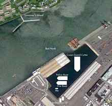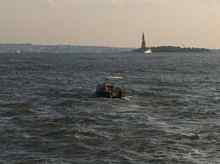 I put into this basin on the Brooklyn side of NY Harbor, and dropped the hook. Although very deep, it looked like excellent protection from a particularly violent thunderstorm predicted to be passing through in a couple of hours. It was the end of the day and I had the basin all to myself, so I tucked myself in with a book to wait it out in the cabin. A short time later I was roused by a Police boat bullhorn. The Police boat accompanied by a Fire boat, a Coast Guard Cutter, and two (2) ambulances.