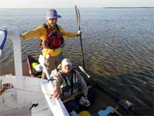 Sunday morning Jackie called to say a plan was in the works to get Andrew off the boat (he had a plane to catch on Monday) and send me more food. Fellow Watertribers Esther Luft aka Whirlwind and Wayne Albert aka Mosquito Magnet were to meet her at Flamingo with a kayak and canoe. Ester and Wayne are opening a paddle sports shop in Miami called Paddle House and they are on good terms with the Park Rangers. They made arrangements with the Rangers to load them and their boats on a Ranger Boat and bring them as close as possible. All this took a while to arrange and it was not until about 4:30 PM that we saw them coming. The ranger boat had stopped over a mile away and was waiting for their return.