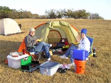 We got on the water a little later than planned due to the shuttle and ran out of wind late in the day so EasyBake became the tow vehicle for Sojourner and OziPearl. Doug and Lori made use of the tow by photographing the beautiful sunset and enjoying a wee nip of Lori’s blackberry brandy. We had lost sight of Stan early in the day as he had motored ahead before trying out his "sailing wings" on his maiden voyage. We arrived at Muleshoe Bend Recreation Area and found Stan’s boat on the beach but he was nowhere in sight. We found him napping in his tent up on the hillside where we joined him after dinner for an evening campfire. Chris made his specialty drink, Dark and Stormy, a mixture of ginger beer and rum, which some drank and others discreetly poured out.