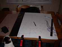 Figure 5 Lofting: Tracing loft lines to fiberboard for stations templates. The flexible steel ruler contributed nearly as much to the final hull shape as the coordinates.