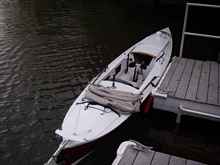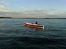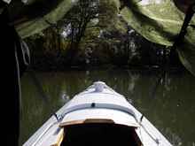 Camping aboard is quite civilized, though a continual exercise in planning. Every time something is unpacked, something else has to be put away to make space. While awake, the sleeping compartment is the storage compartment and the cockpit is kept clear. The process is reversed at bed time. Gear shuffling aside, the boat is very comfortable. The drive well makes for a handy food preparation table. If you really get bored, the slot in the drive trunk provides a “glass bottom boat” view of whatever is sharing the space under your boat. And finally, the sleeping accommodations are great. At 6 ft. 3 in. long and 40 inches wide, the compartment is so large that I end up sleeping against one of the “corners”. Sometimes at night I’ll wake up and intentionally rock to the boat just to enjoy the sensation of being afloat.