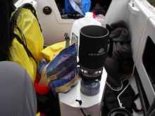 Figure 12a Kitchen: The pedal well cover makes a convenient table; just don’t try to move about the boat.