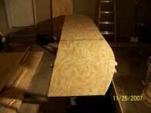 This is my method of bending the skins using big turnbuckles and 2 X 4s. The two bottom sheets join at the center of the bottom. It was still difficult to bend the wood this much, about at it's limit. I had to drive at least a dozen #10 screws 2 ½ long on the plywood end to get it to hold position.